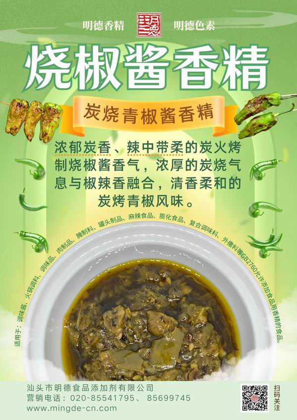 炭火烤制燒椒醬風味 應用于拌飯醬、辣醬中,炭烤香與青椒辣椒香結合,辣中帶柔,清香柔和,醬香十足,香氣撲鼻。明德 燒椒醬香精 耐溫性好、適用性廣、融合度高、香味醇厚。產品參數