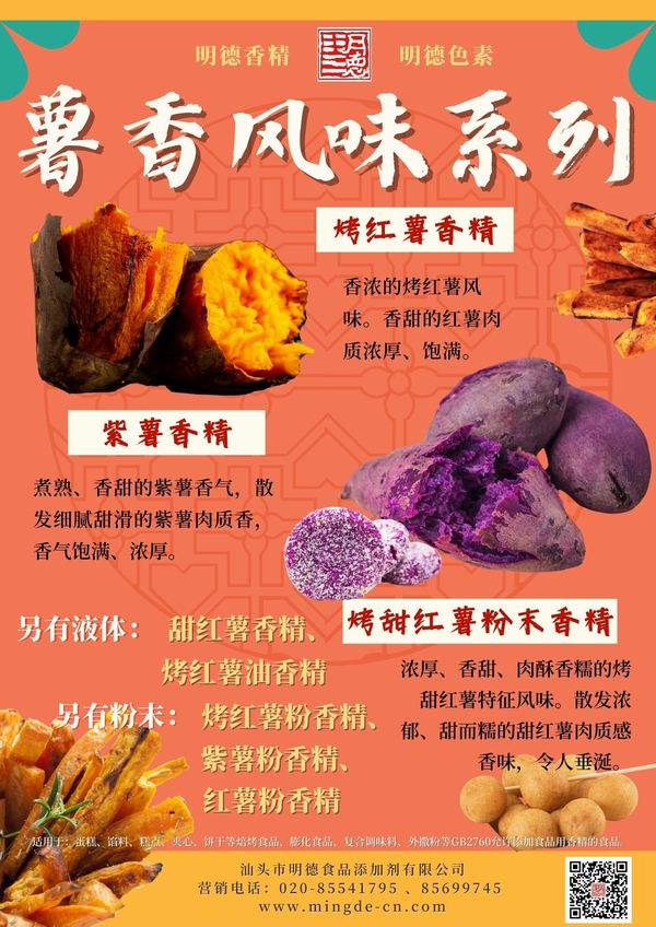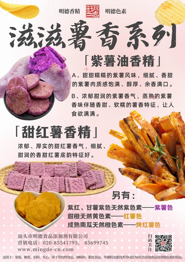 在薯味香精領(lǐng)域我們數(shù)十年潛心專研,迎合市場需求,滿足消費者喜好,汕頭市明德食品添加劑有限公司,推出了多種風(fēng)味的番薯風(fēng)味香精,如:紫薯香精、紅薯香精、烤紫薯香精、烤紅薯香精、甜紅薯香精等。