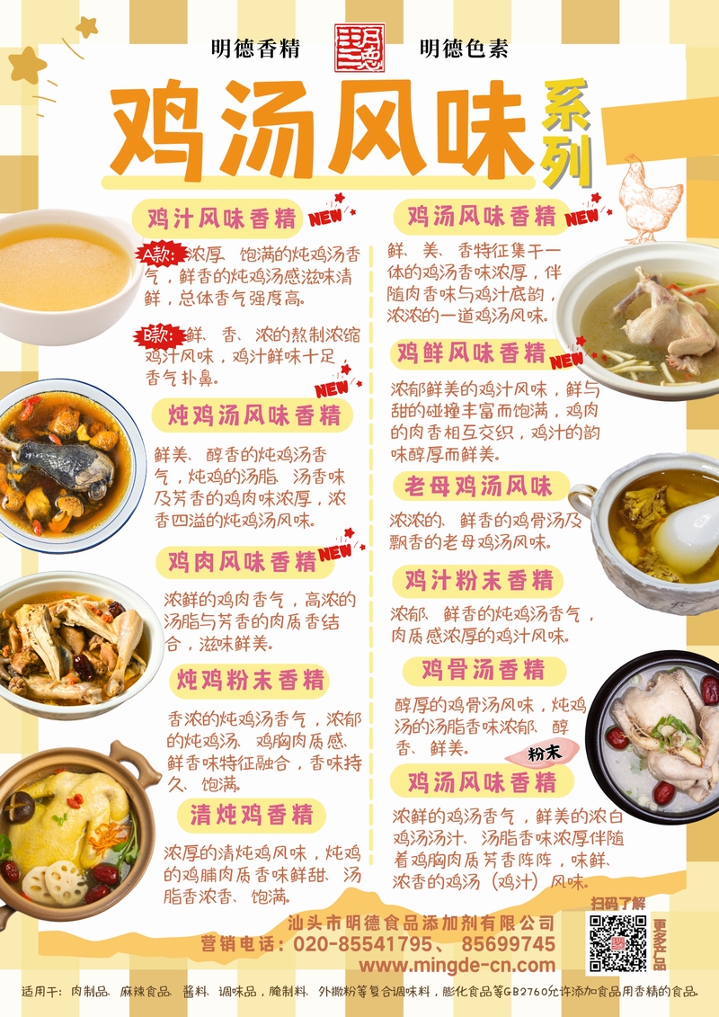 明德雞湯風(fēng)味香精 濃郁鮮香 還原地道雞湯本味汕頭市明德食品添加劑有限公司的雞湯風(fēng)味香精系列,涵蓋雞汁、雞湯、雞鮮風(fēng)味、老母雞湯、雞肉風(fēng)味、雞粉末、雞骨湯、清燉雞等多種品類。產(chǎn)品具備真實(shí)的雞肉鮮香、湯香、油香與骨香特征,能夠為醬料、調(diào)味品、肉制品、腌制料及復(fù)合調(diào)味料等B端應(yīng)用提供穩(wěn)定、濃郁的雞湯風(fēng)味解決方案,幫助工廠快速打造風(fēng)味醇厚、回味悠長的雞香產(chǎn)品。